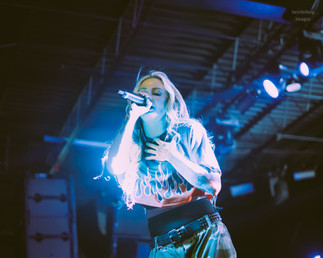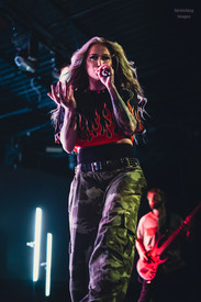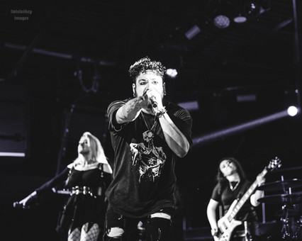 With the stage now scorching hot after Remember Me set the temp to broil, LYLVC (pronounced lilac) pounced out next. Their roots are in Raleigh, NC, but their growth has reached globally with a recently sold-out U.K./Europe tour. They have dual vocalists that generate an excellent rap/rock show. Heavily influenced by nu-metal, the combination rock/rap vocals were done exceptionally well by singers Alyse and Oscar (rap vocals). Their sound all together is a smoking hot fusion of genres. They have previously shared stages with Atreyu, P.O.D., Pop Evil among others. Their performance was immediately scorching hot, causing a metaphorical thermal shutdown of power to the mic. The irony in this is that Alyse is a legal hacker, working with cyber security and technology. So, for what some may call a fault in the sound, I consider this quite fitting and poetic. The band’s post-apocalyptic theme and song “Barely Human” touches on how the world would be after a virus took over and people had to replace lost limbs with robotic parts. The song touches on the fear that would exist while living in the new world. The song also invoked thoughts as to the current real life we live in with AI and technology being the cornerstone to every aspect of life and survival. Technology’s advancement has had its place, but also its downfall as it has ripped basic human interactions apart and caused a disconnect of human emotions and how to interact with others. Alyse has said, “Sometimes, I personally struggle with turning off emotions and I dissociate when I need to be strong or cold in order to survive.” It’s all about finding the balance, which also metaphorically fits with the incredible production in LYLVC’s mixed-genre sound. With Alyse’s background in legal hacking, I feel confident that she would be a survivor in the band’s hypothetical world. The whole time they were on stage, the performance was packed full of energy and crowd engagement. Oscar had a wild and playful demeanor.